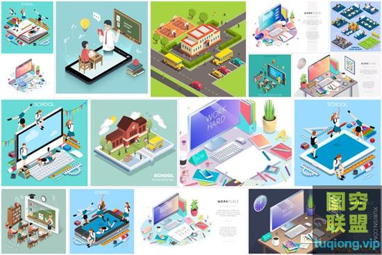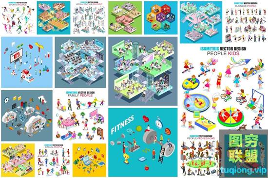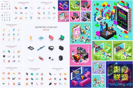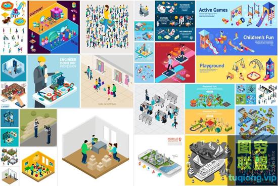 图穷联盟PS素材 » 2.5D扁平化等距立体插画城市建筑手机娱乐人物矢量UI素材