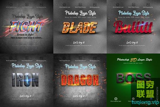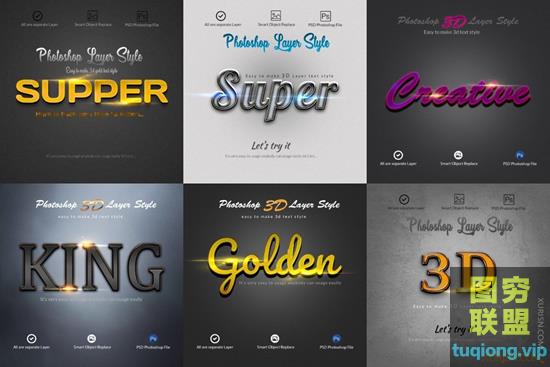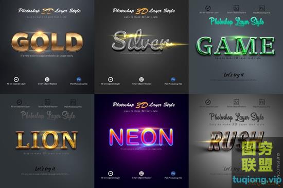 图穷联盟PS素材 » 18款3D文字特效PS图层样式智能对象PSD模板Photoshop Layer Style
