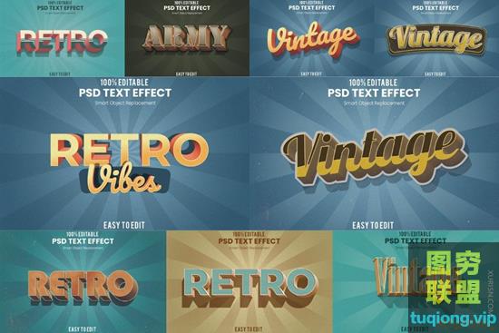 图穷联盟PS素材 » 9款复古3D文字特效PSD模板Vintage 3D Text Effect Bundle