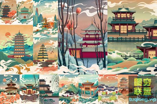 图穷联盟PS素材 » 35款古建筑中国风国潮城市海报插画扁平风PSD模板设计素材
