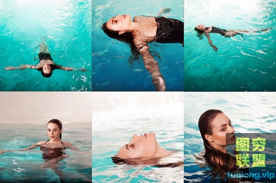这个包包括 130 张照片,来自泳池中的水下照片拍摄,有两个模特。其中有一张模特漂浮在水面上的照片。
