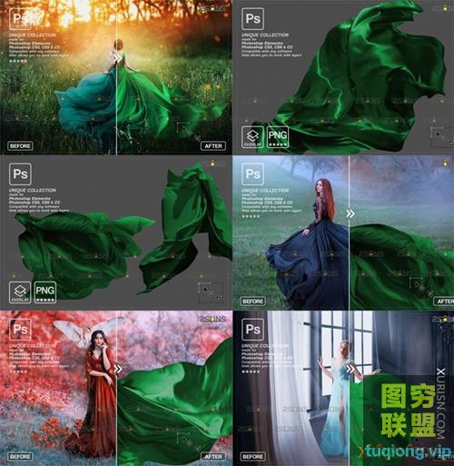 图穷联盟PS素材 » 163张绿色飞舞飘动裙摆飘纱PNG透明合成素材