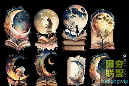 标题:8张高清书本月亮幻想PNG元素剪贴画
