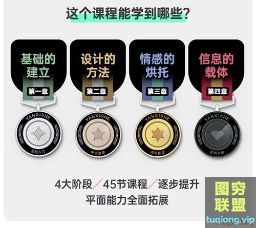 基础的建立、设计的方法、情感的烘托、信息的载体4大阶段45节课逐步提高平面能力全面拓展。
