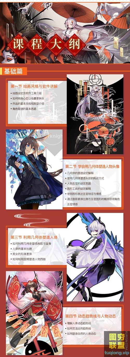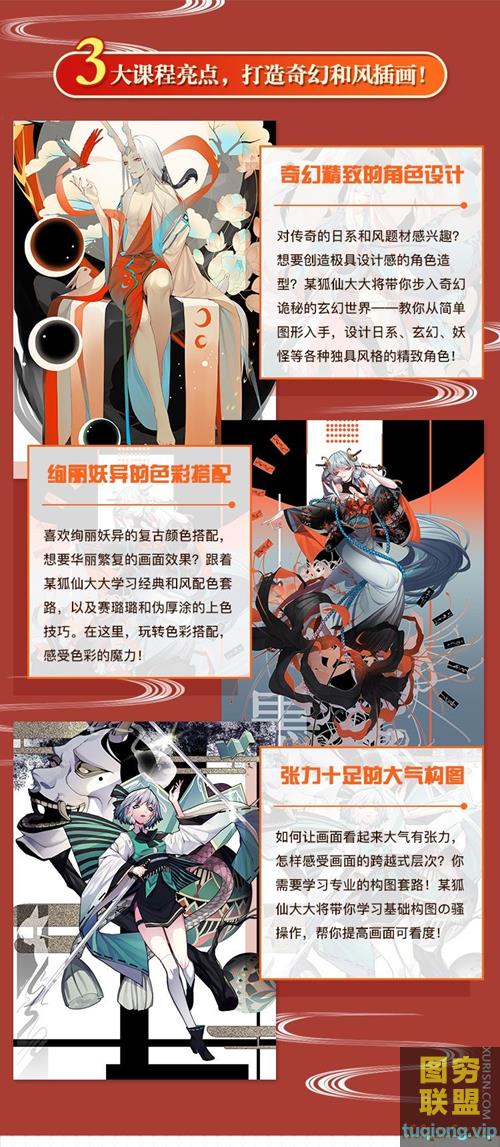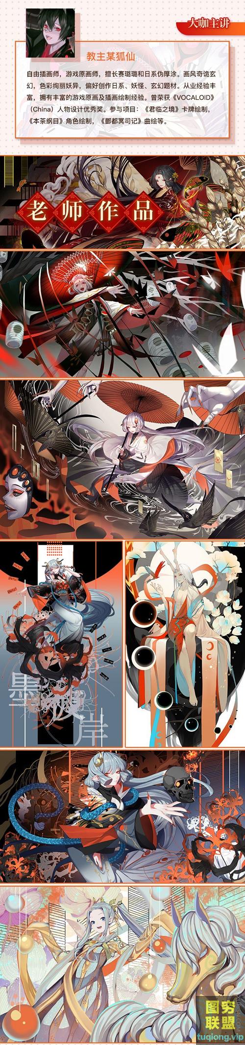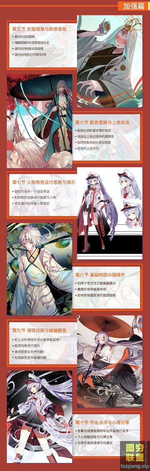 该课程为日式和风插画设计班,内容涵盖工具与画风介绍、入门临摹、头像五官、人体基础、动态塑造、褶皱质感、配色方法、角色设计、构图技巧等内容!奇幻精致的和风角色设计,绚丽妖异的色彩搭配,张力十足的大气构图~快来跟教主某狐仙大大一起,画出奇幻炫丽的和风插画吧!