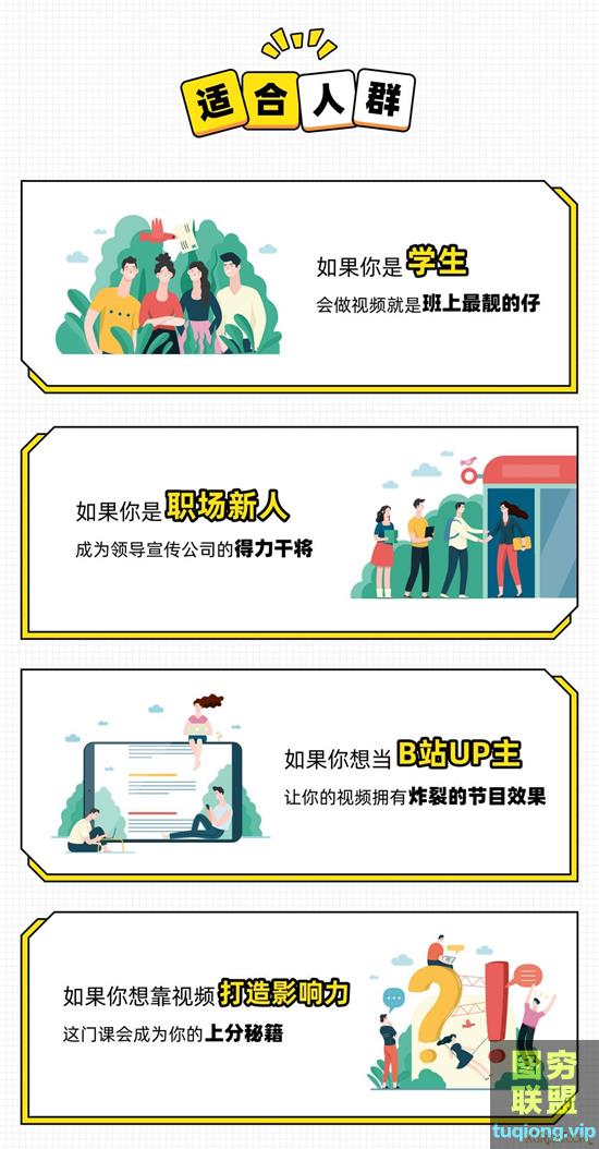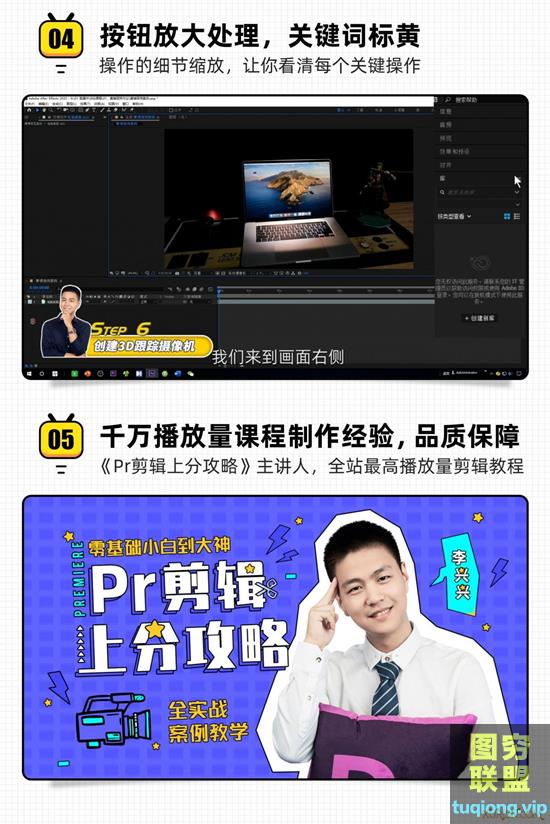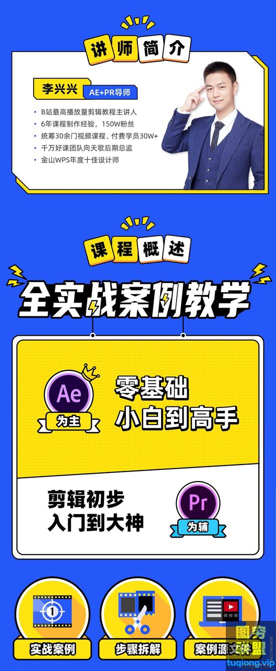 李兴兴:B站最高播放量剪辑教程主讲人;全网150万粉丝;统筹30余门在线课程、付费学员超30W;向天歌后期总监;金山WPS年度十佳设计师