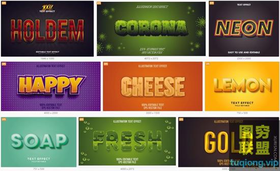 图穷联盟PS素材 » 9P可编辑字体效果矢量设计文字集Editable font effect text collection