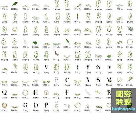 图穷联盟PS素材 » 1.8G手绘绿色树枝树叶花环英文字母PNG透明免抠素材