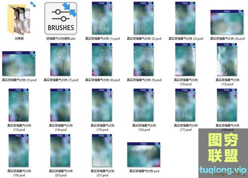 图穷联盟PS素材 » 20P真实玻璃雾气水珠朦胧效果PSD透明图层素材+67个对应笔刷