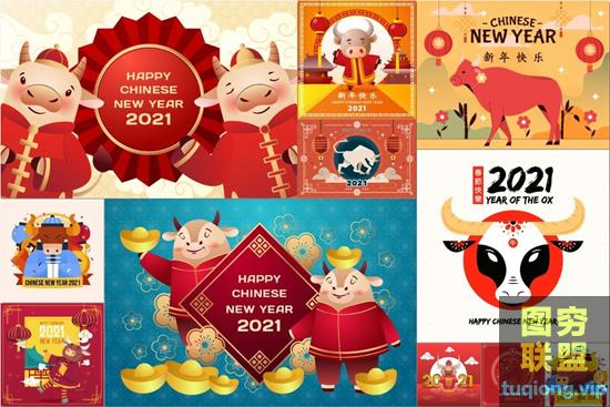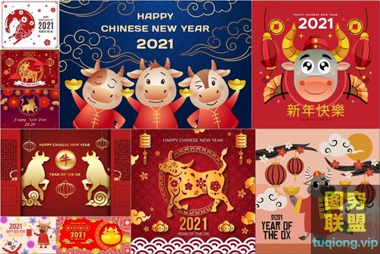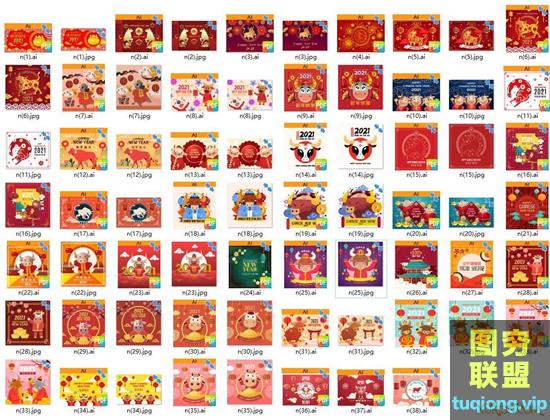 图穷联盟PS素材 » 38款2021年喜庆春节牛年迎新年舞台年会海报背景AI矢量素材